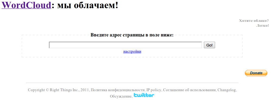 Вообще, подобных сайтов в сети полно. Идея-то лежит на поверхности. Я выбрал "сайтом дня" именно WordCloud, потому что у него самое приятное на вид облако и один из самых скромных интерфейсов.