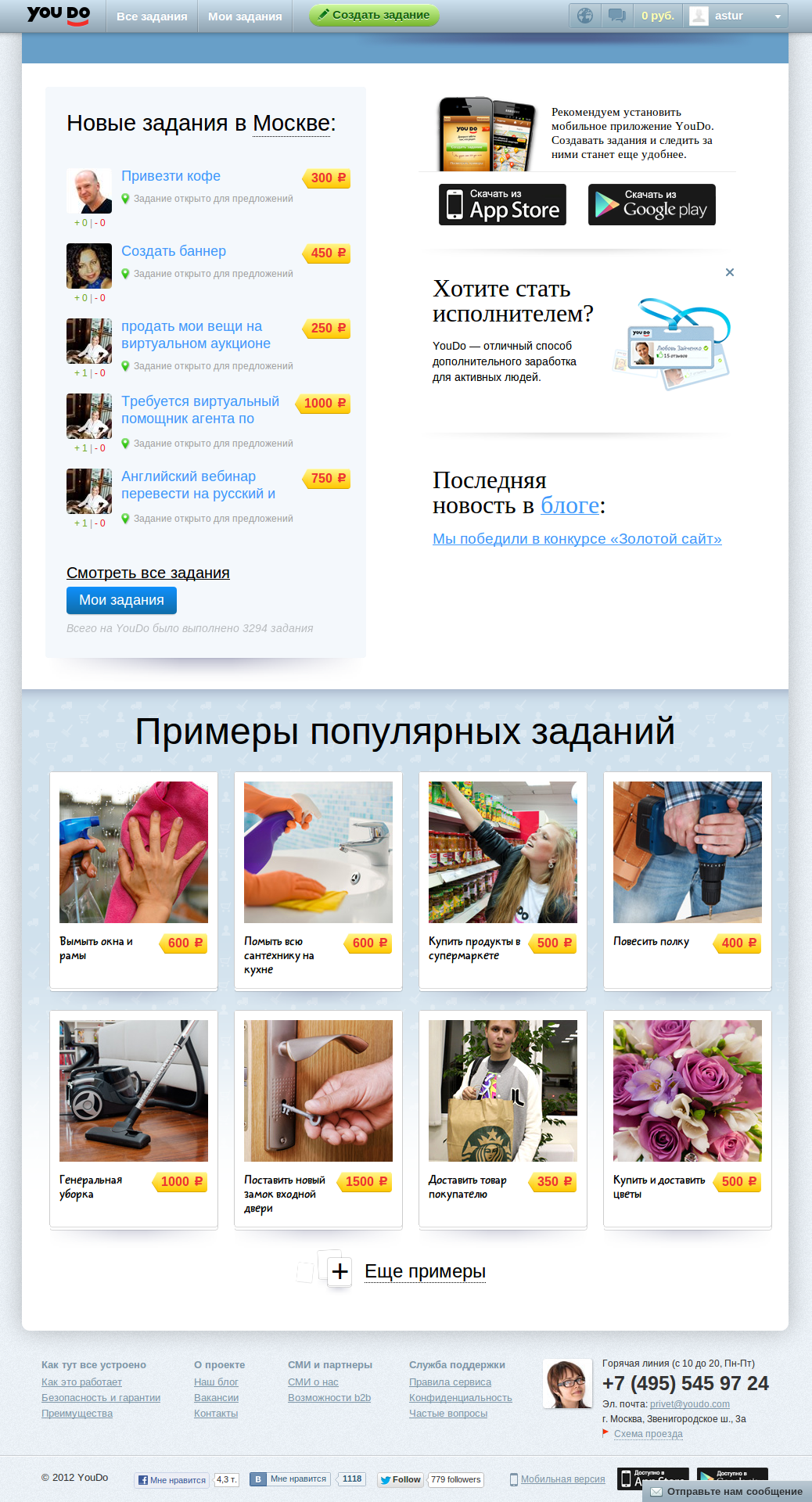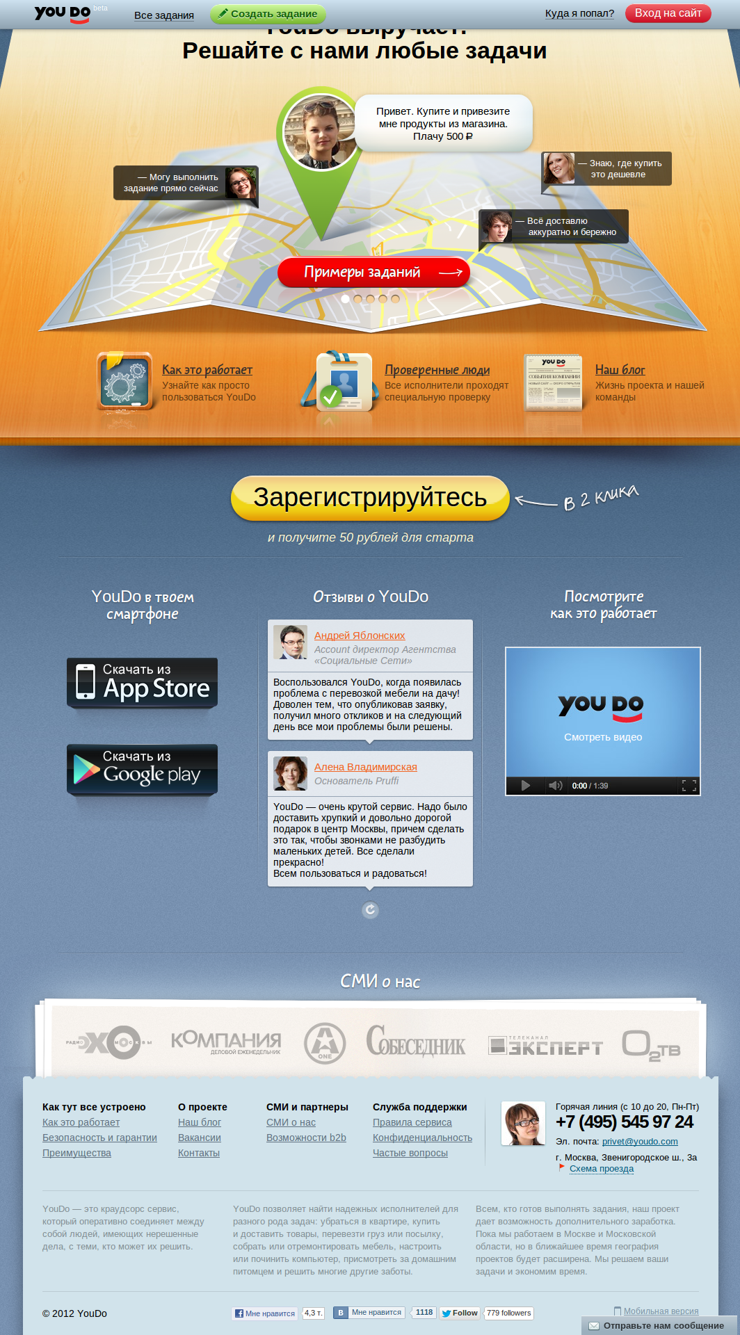 В первое утро после праздников вполне логично объявить сайтом дня сервис, помогающий свалить свои дела на кого-нибудь другого. Сегодня это будет сайт YouDo, который пока выглядит в этой нише самым перспективным. Чем-то напоминает печально известный фриланс.ру, но для обычных дел, а не для "дизайна на PHP". По большому счёту YouDo - это сервис знакомств заказчиков и исполнителей самых различных потребительских услуг.