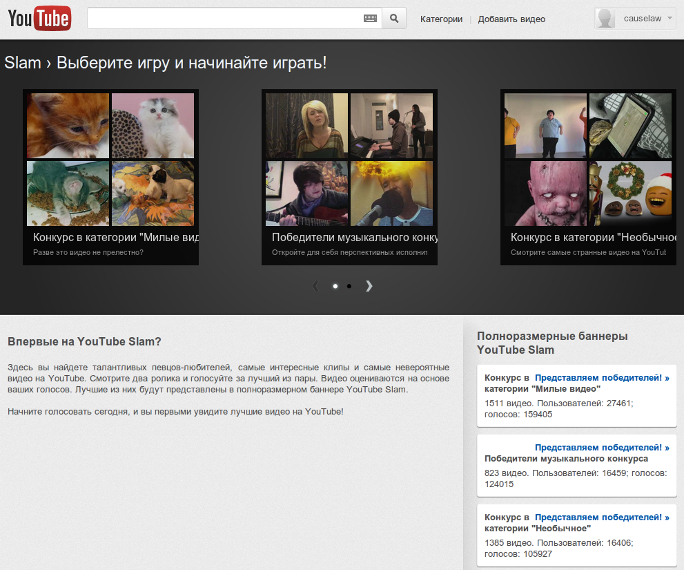 Сервис YouTube Slam сразу правильно позиционирует себя перед посетителем, предлагая "выбрать игру" и "начать играть". Вот в чём фишка! Это не площадка для продвижения талантливых режиссёров, операторов или актёров. Это игра. Игра в голосование. Игра в строгое жюри. В арбитров, чей голос кому-то реально важен.