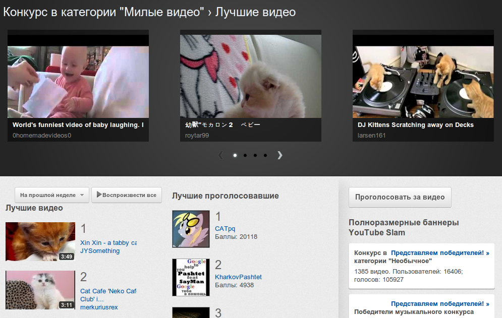 Серьёзный плюс YouTube Slam, как антистрессового таймкиллера, это возможность сравнивать ролики только по одному параметру. Отдельно выбираются самые смешные, самые музыкальные, самые "милые" и так далее. В общем, делая выбор можно не напрягаться, а искренне следовать общепринятым шаблонам. Так что никто не удивится, что в конкурсе на самое "милое" видео побеждают "ребёнки и котёнки", как и везде.