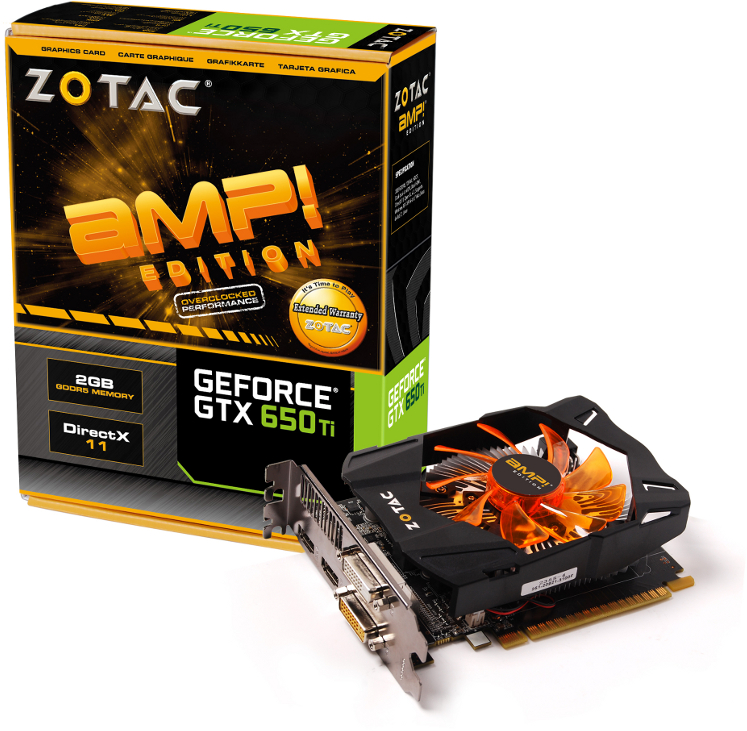 Видеокарты ZOTAC GeForce GTX 650 Ti выпускаются с 1 ГБ (модель ZT-61101-10M) и 2 ГБ (модель ZT-61102-10M) видеопамяти стандарта GDDR5, что позволяет пользователям подобрать оптимальный вариант под свои задачи. Переход к версии ZOTAC GeForce GTX 650 Ti AMP! Edition с 2 ГБ видеопамяти (модель ZT-61103-10M) означает рост производительности на 12%, который понравится требовательным геймерам.