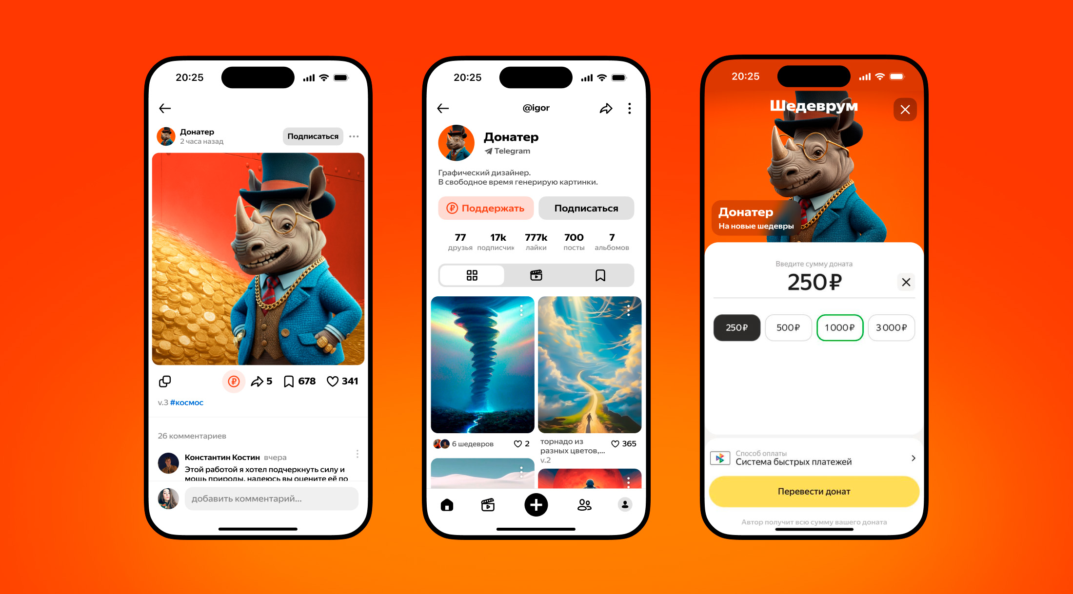 Подключить донаты можно в своём профиле в Шедевруме. После этого под публикациями появится кнопка отправки донатов в виде монеты. Отправлять их смогут не только подписчики, а все пользователи сервиса. Если им понравится работа, они смогут прямо в ленте нажать на кнопку под постом и перечислить любую сумму. Кнопка также появится в профиле пользователя — так его можно будет просто поддержать, не обязательно за какую-либо конкретную работу.