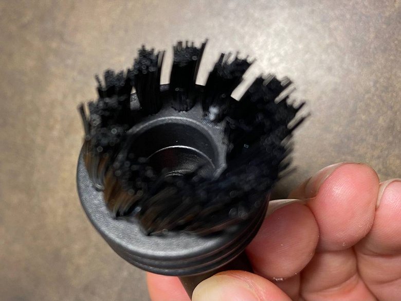 Отдельно стоит отметить нейлоновую щетку: даже при минимальном использовании щетина быстро погнулась и потеряла форму. Можно сделать вывод, что уже после 2–3 операций такая насадка скорее всего придет в негодность и ее эффективность резко снизится.