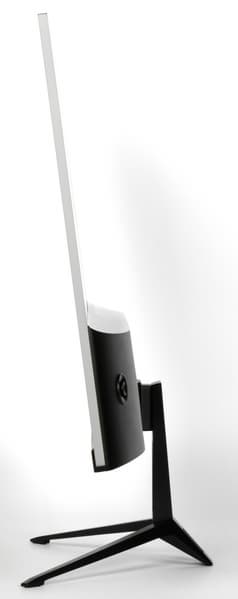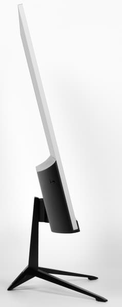 Дизайн строгий, игровую направленность монитора ничего не выдает. Внешняя поверхность матрицы черная, полуматовая (зеркальность хорошо выражена), внешний слой матрицы жесткий. Спереди экран выглядит как монолитная поверхность, ограниченная снизу неширокой планкой из пластика с матовой черной поверхностью, а по периметру — узкой окантовкой из алюминиевого сплава с матовой анодированной поверхностью. Выведя изображение на экран, можно увидеть, что на самом деле между внешними границами экрана и собственно областью отображения есть неширокие поля (сверху и с боков примерно по 7 мм, а снизу — 2 мм до фронтальной планки и 21 мм до нижнего торца) .