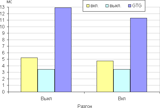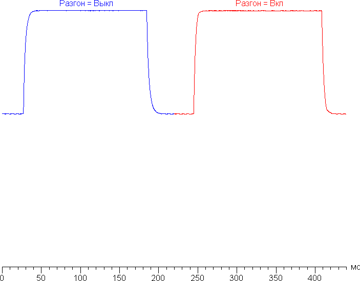 Время отклика зависит от значения настройки Разгон, которая управляет разгоном матрицы. Разгон можно включить или выключить. График ниже показывает, как меняется время включения и выключения при переходе черный-белый-черный (столбики «вкл.» и «выкл.»), а также среднее суммарное время для переходов между полутонами (столбики GTG) в случае режима с частотой обновления 165 Гц для двух возможных значений этой настройки: