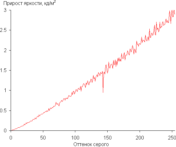 Для оценки характера роста яркости на шкале серого мы измерили яркость 256 оттенков серого (от 0, 0, 0 до 255, 255, 255). График ниже показывает прирост (не абсолютное значение!) яркости между соседними полутонами:
