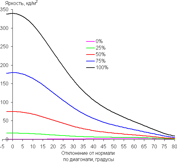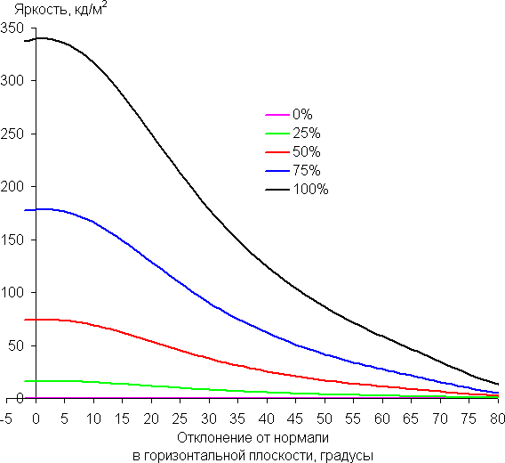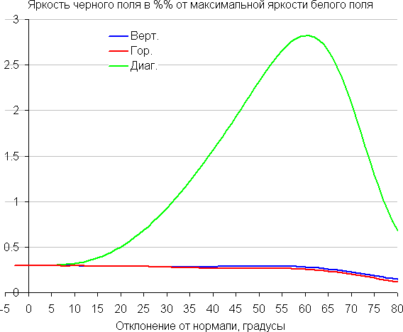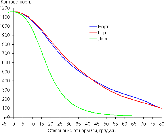 Углы обзора по снижению яркости неширокие, что, к сожалению, часто стало встречаться в современных быстрых матрицах IPS. При отклонении в диагональном направлении яркость черного поля начинает резко возрастать уже при 20°-30° отклонения от перпендикуляра к экрану. Максимальной высветление не очень высокое, но если сидеть не очень далеко от экрана, то черное поле по углам будет заметно светлее, чем в центре (и с красно-фиолетовым оттенком). Контрастность в диапазоне углов ±82° только в случае отклонения по диагонали вплотную приближается к отметке 10:1, но все же не опускается ниже.