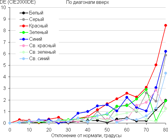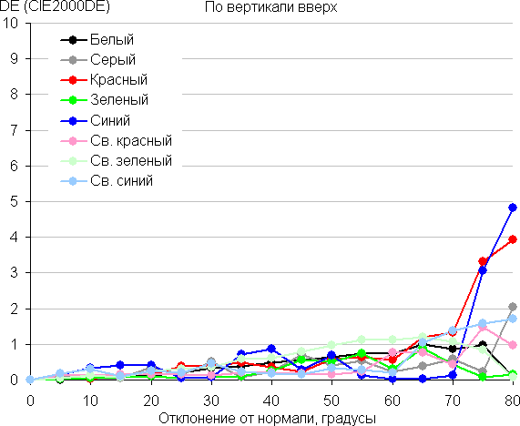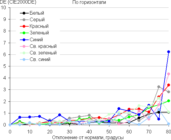 Для количественной характеристики изменения цветопередачи мы провели колориметрические измерения для белого, серого (127, 127, 127), красного, зеленого и синего, а также светло-красного, светло-зеленого и светло-синего полей во весь экран с использованием установки, подобной той, что применялась в предыдущем тесте. Измерения проводились в диапазоне углов от 0° (датчик направлен перпендикулярно к экрану) до 80° с шагом в 5°. Полученные значения интенсивностей были пересчитаны в ΔE относительно замера каждого поля при перпендикулярном положении датчика относительно экрана. Результаты представлены ниже: