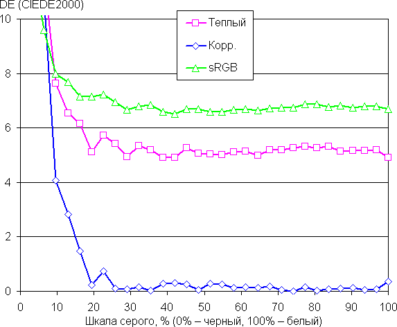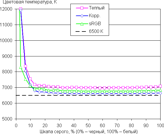 Цветовой баланс в самом ярком режиме (то есть без коррекции — профиль Пользователь, усиление красного, зеленого и синего — 50, 50 и 50) плохой, так как цветовая температура существенно ниже стандартных 6500 К (порядка 5900 К), а отклонение от спектра абсолютно черного тела (параметр ΔE) выше 18 единиц, что даже для потребительского устройства считается плохим показателем. Хорошими с точки зрения цветового баланса являются встроенные профили Теплый и sRGB. Также мы попытались вручную скорректировать цвета, регулируя усиление трех основных цветов. Удалось еще больше приблизить цветовую температуру к 6500 К и существенно снизить ΔE, сохранив невысокую вариацию этих параметров на шкале серого. Графики ниже показывают цветовую температуру на различных участках шкалы серого и ΔE в случае профилей Теплый и sRGB, а также и после ручной коррекции (подписано Корр., усиление красного, зеленого и синего — 44, 50 и 47):