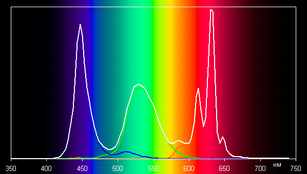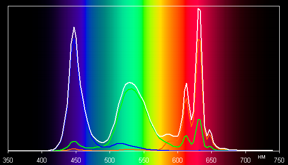 Ниже приведен спектр для белого поля (белая линия), наложенный на спектры красного, зеленого и синего полей (линии соответствующих цветов) в случае исходного цветового охвата:
