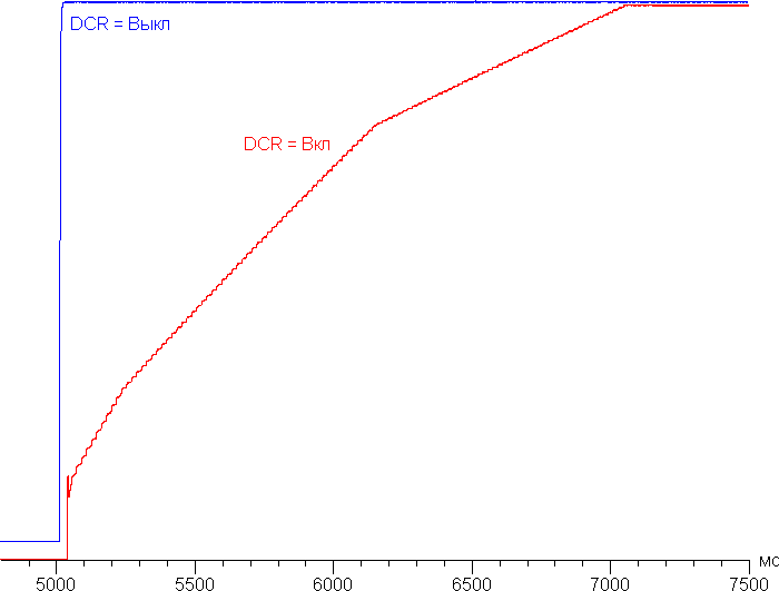 При включении режима DCR с динамическим управлением яркости установившаяся контрастность формально возрастает до бесконечности, так как на черном поле во весь экран подсветка выключается совсем через примерно через 5 секунд. График ниже показывает, как увеличивается яркость (вертикальная ось) при переключении с черного поля (после пяти секунд вывода) на белое при выключенной и включенной динамической подстройке яркости: