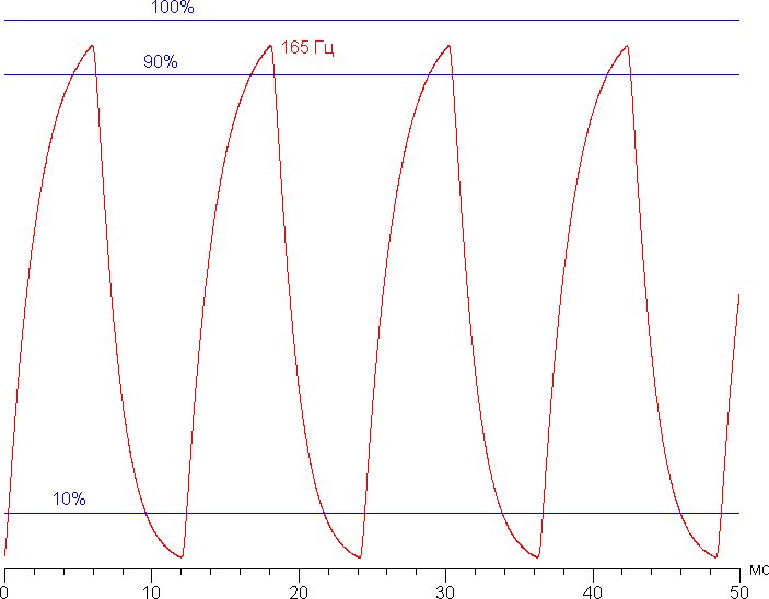 Приведем зависимость яркости от времени при чередовании белого и черного кадра при 165 Гц кадровой частоты (график с подписью 165 Гц):