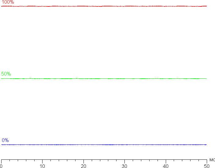 На любом уровне яркости модуляция подсветки отсутствует, что исключает видимое мерцание экрана. Для тех, кто привык распознавать знакомое сокращение, уточним: ШИМ отсутствует. В доказательство приведем графики зависимости яркости (вертикальная ось) от времени (горизонтальная ось) при различных значениях настройки яркости: