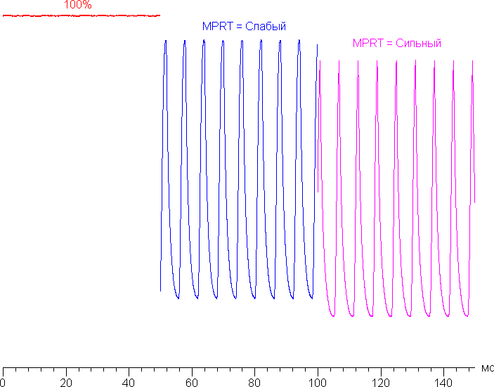 Есть режим со вставкой темного кадра (черным он в данном случае не является) с названием MPRT. Зависимости яркости (вертикальная ось) от времени (горизонтальная ось), когда яркость установлена на максимум (левая половина — 100%), и когда включена функция MPRT (правая половина, два уровня):