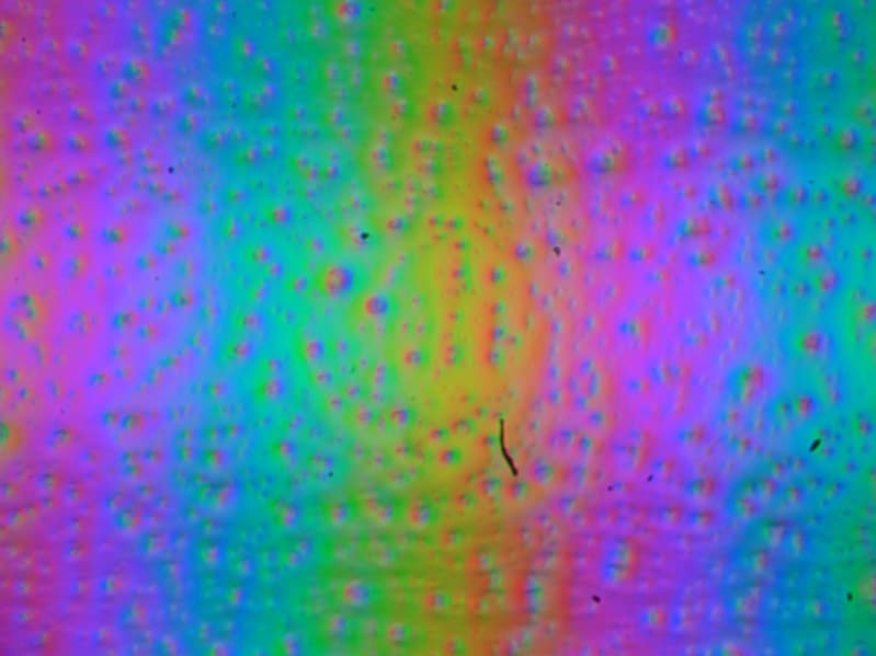 Фокусировка на поверхности экрана выявила хаотично расположенные микродефекты поверхности, отвечающие собственно за матовые свойства: