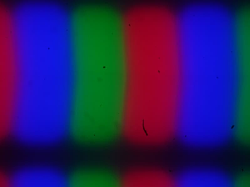Из-за матовой поверхности экрана четкого изображения пикселей получить не удалось (черные точки — это пыль на матрице фотоаппарата), однако характерная для IPS структура субпикселей просматривается: