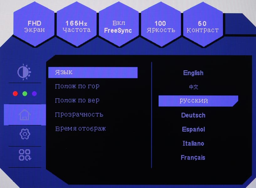 Меню достаточно крупное, надписи читаемые. Навигация удобная, так как все делается только джойстиком, не нужно переносить палец на кнопки, к тому же списки зациклены. При настройке изображения меню остается на экране — это несколько мешает оценке вносимых изменений. Можно переместить меню на экране, включить прозрачность фона меню и выбрать задержку автоматического выхода из меню. Присутствует русская версия экранного меню.
