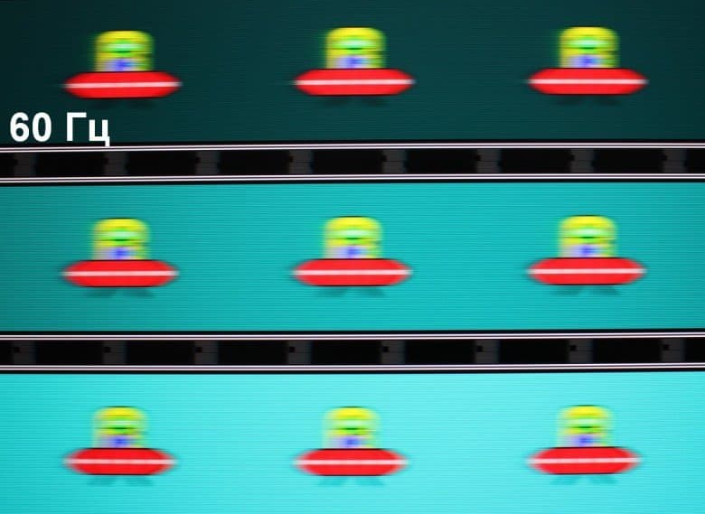 Попробуем представить, что было бы в случае матрицы с мгновенным переключением пикселей. Для нее при 60 Гц объект со скоростью движения 960 пиксель/с размывается на 16 пикселей, при 120 Гц — на 8 пикселей (скорость 960 пиксель/с), при 165 Гц — на 6 пикселей (скорость 990 пиксель/с). Размывается, так как фокус зрения движется с указанной скоростью, а объект неподвижно выводится на 1/60, 1/120 или на 1/165 секунды. Для иллюстрации этого сымитируем размытие на перечисленное количество пикселей:
