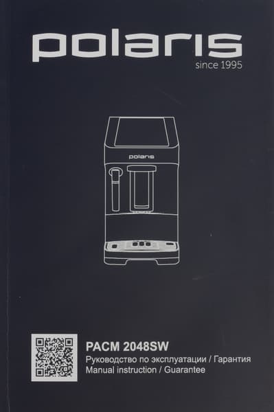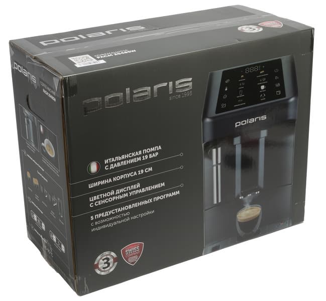 Кофемашина поставляется в картонной коробке, оформленной в традиционном дизайне Polaris. Печать на коробке полноцветная. Оформление строгое: фон темный. На нем выделяется небольшое количество ярких элементов. Спереди — полноцветная фотография устройства. На боковых гранях находятся расширенная информация, а также перечислены основные характеристики устройства. Боковые ручки для переноски предусмотрены, так что донести коробку до дома будет легко.