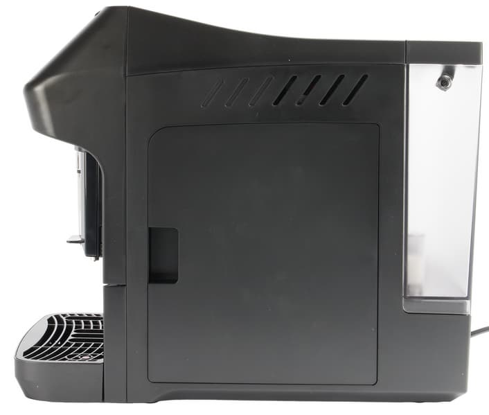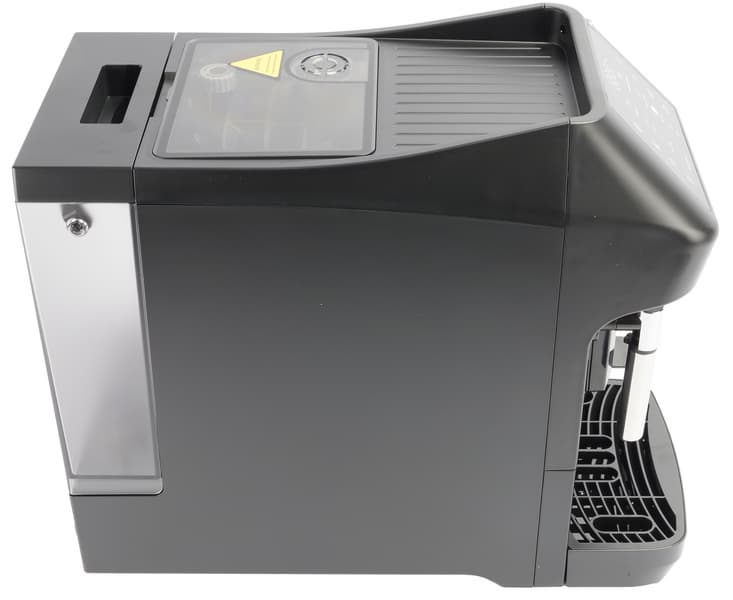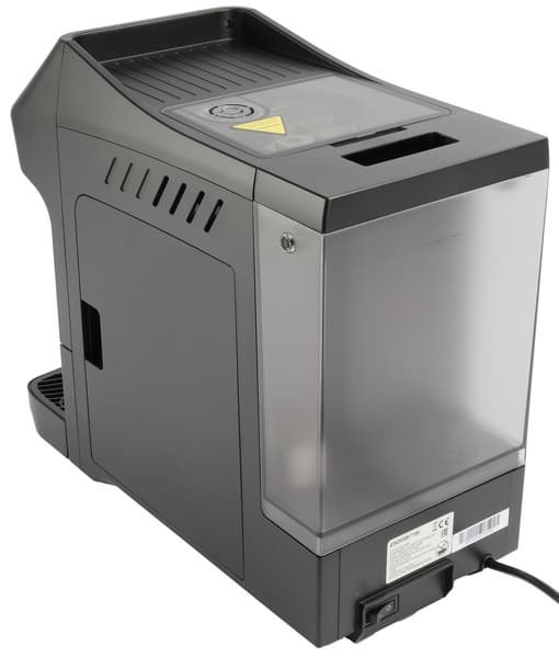 Итак, материал корпуса. Черный матовый пластик не слишком активно собирает отпечатки пальцев, за что ставим ему «плюсик». Наличие скругленных элементов в передней части корпуса придает и без того компактной кофемашине еще более изящный вид.