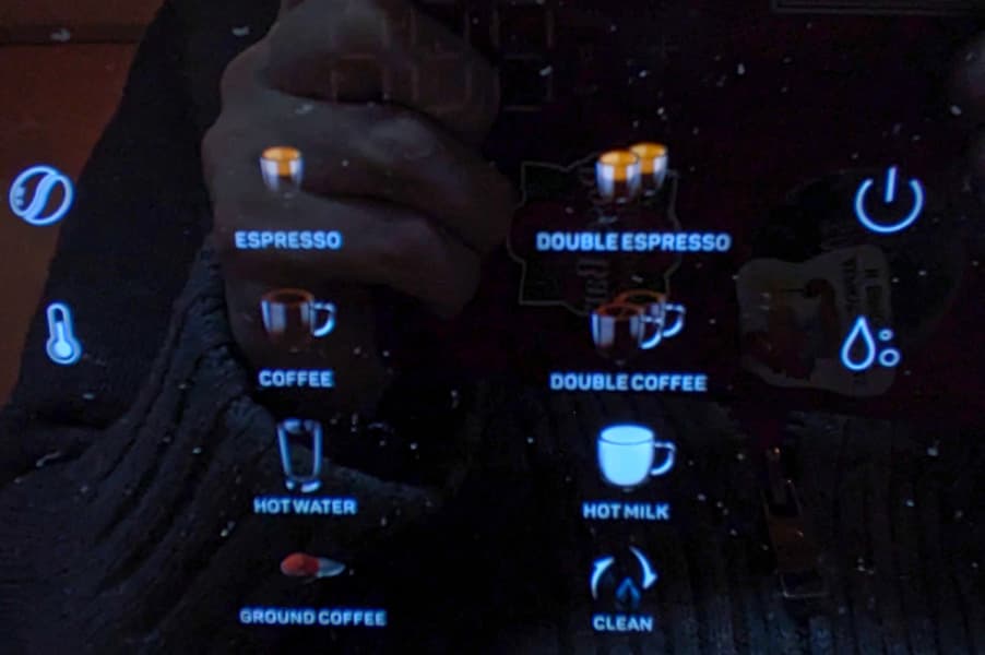 Основной орган управления кофемашиной — панель с сенсорными кнопками, оформленная под цветной дисплей высокого разрешения.