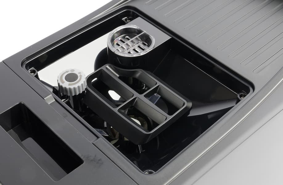Под заварочным блоком предусмотрен небольшой пластиковый поддон, куда будут попадать остатки кофе, которые просыпались мимо (это совершенно нормально). Отсек для отработанных кофейных зерен расположен спереди, вместе с поддоном для сборка капель, поэтому в отсек с заварочным блоком мы будем заглядывать не слишком часто.