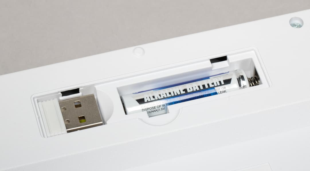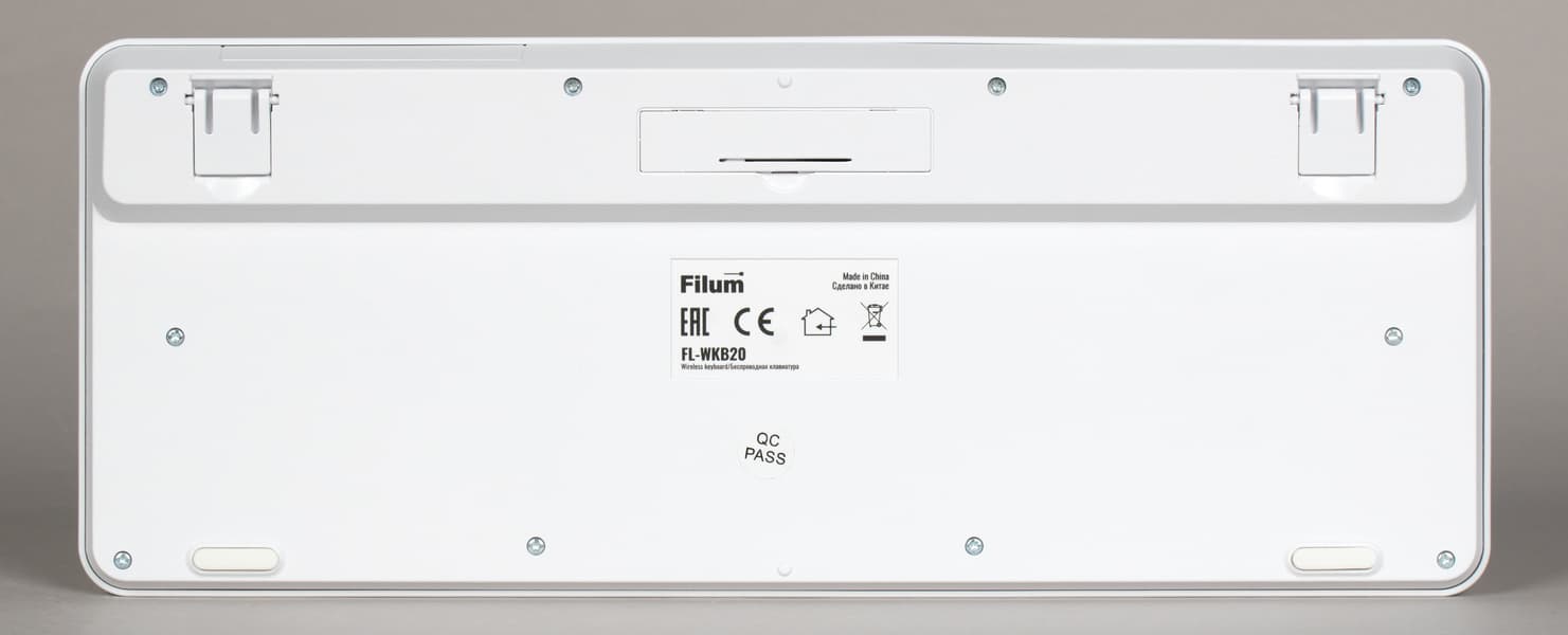 Клавиатуры линейки Filum FL-WKB рассчитаны исключительно на беспроводное подключение к компьютерам и прочим устройствам. Проводных интерфейсов нет даже для зарядки встроенного аккумулятора — по причине отсутствия такового: используется более старая схема с одним «мизинчиковым» элементом питания ААА. Не в последнюю очередь это экономия, но многим она как раз нравится — с учетом автономности современных беспроводных устройств, проще и быстрее изредка менять батарейку, чем возиться с зарядкой. Тем более, что и ресурс аккумуляторов всегда ограниченный, а здесь — потенциально вечная тема: пока не сотрутся клавиши, либо просто не надоест.