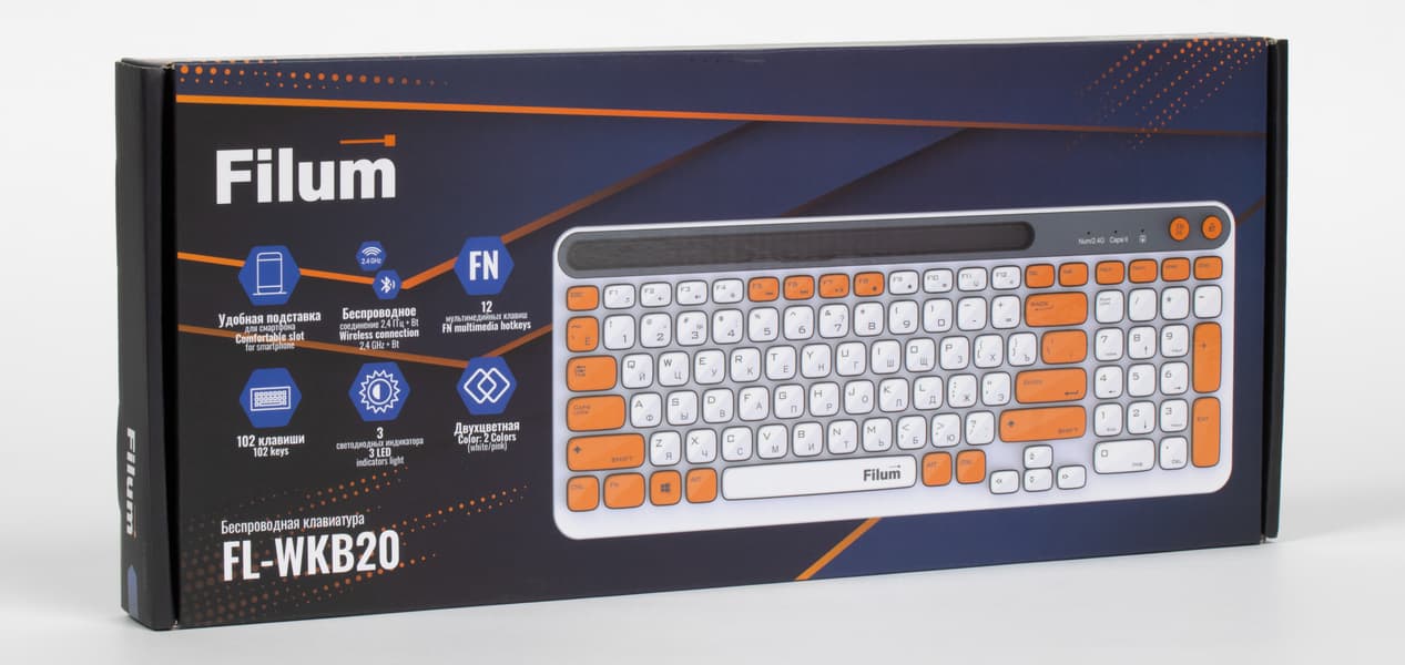 Несколько представителей этого направления периферии мы уже изучали, а сегодня на повестке дня, как несложно догадаться, еще одно. Или не одно: в линейке Filum FL-WKB формально есть четыре модели с разными номерами, но отличаются они исключительно цветом части клавиш. У попавшей к нам в руки FL-WKB20 они оранжевые, но есть версии с серыми (FL-WKB25), розовыми (FL-WKB05) или мятными (FL-WKB15). Других различий между клавиатурами нет, так что, протестировав одну, мы познакомимся со всей линейкой. К чему и приступим.
