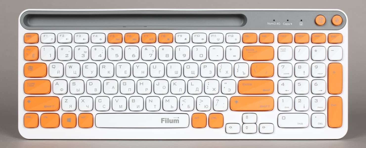 В общем, получается компромиссное решение, неплохо справляющееся с разными сценариями работы, пусть ни с каким и не идеально. Типичное домашнее многофункциональное устройство, которое должно и с компьютером нормально справляться (если не вводить данные миллионами символов), и с другими устройствами совместимость обеспечить. О них позаботились отдельно — специальная прорезь в верхней части клавиатуры является специальной подставкой для… телефонов и планшетов с диагональю экрана до 11 дюймов. Единственное нарекание — планшет стои́т слишком вертикально, причем особо с углом не поработаешь, так что полной заменой специализированным планшетным клавиатурам Filum FL-WKB не является. Но специализированные есть не для всех моделей планшетов, а когда есть — стоят дороже, так что смысл в такой функциональности есть. Тем более, производителю она ничего не стоила практически, но пригодиться может. Но можно о подставке для планшета позаботиться самостоятельно — не обязательно пользоваться встроенной.