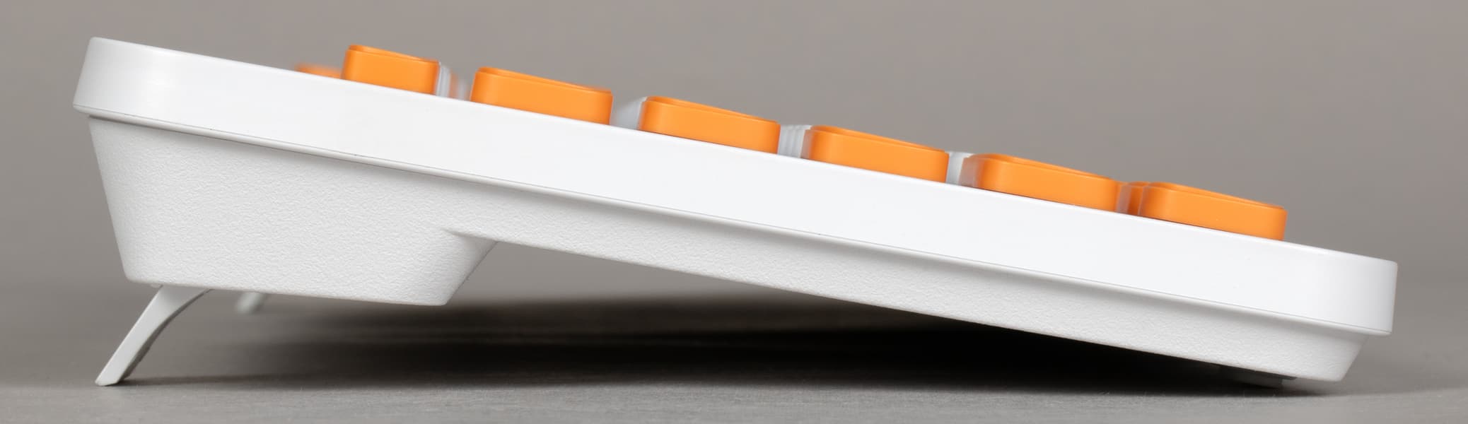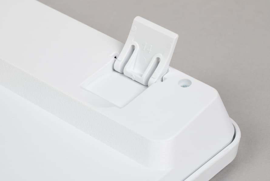 Впрочем, о настольном использовании здесь тоже позаботились. Клавиатура на столе стоит немного под углом всегда из-за разницы в толщине — от примерно 15 мм передней части переходим к 25 мм в заднем утолщении. Но последнее можно приподнять еще примерно на сантиметр, благодаря складным ножкам (редкий элемент для компактных беспроводных моделей).