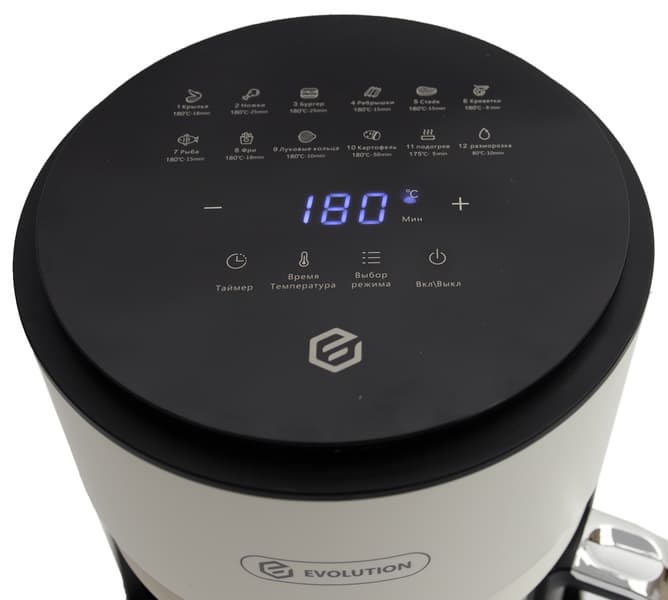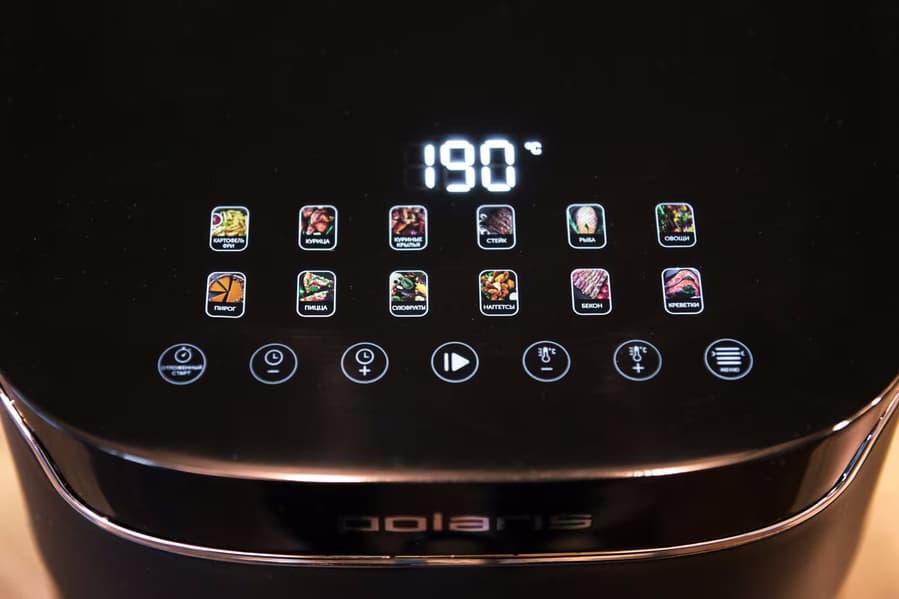 Симпатичный прибор молодого российского бренда выполнен, как нам показалось, на совесть: качественная сборка, стильный внешний вид. Заявлен увеличенный объем корзины и расширенный набор авторежимов, но, как мы видим в этом дайджесте, при таких же примерно габаритах бывает объем и чуть больше. Ну, а 11 авторежимов немало, но уже вполне стандартно для современных аэрогрилей. Важно, что все авторежимы на панели управления обозначены понятными пиктограммами, сенсоры крупные, дисплей информативен и в целом управление интуитивно понятно (хотя русифицировать подписи не помешает, раз уж бренд российский). В ходе программы параметры приготовления можно скорректировать, что очень удобно.