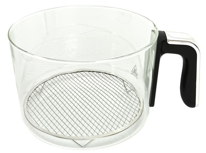 Этот аэрогриль (производитель именует его аэрофритюрницей) отличается от большинства аналогичных приборов материалом чаши — это жаропрочное боросиликатное стекло. Плюсы такого решения: можно наблюдать за процессом приготовления и легко мыть (мытье в посудомоечной машине запрещено, однако плохого может там приключиться со стеклом, мы не поняли). Минус тоже есть: стенки чаши сильно нагреваются, надо быть аккуратнее. Внутрь чаши устанавливается металлическая решетка диаметром 16,7 см, на ней можно разместить продукты или форму с блюдом.