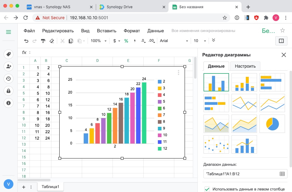 Профессиональные инструменты редактирования Synology Office позволяют быстро и легко создавать рабочие документы, электронные таблицы и слайды, а функции синхронизации и сохранения файлов в реальном времени дают возможность повысить эффективность работы сотрудников и обеспечивают безопасность данных. Здесь есть многие привычные инструменты: возможности форматирования текста и построения графиков, редактор формул и многое другое. Присутствует прямая и обратная совместимость с Microsoft Office. Файлы Excel, Word и PowerPoint можно преобразовывать в электронные таблицы, документы и слайды в Synology Office и наоборот.