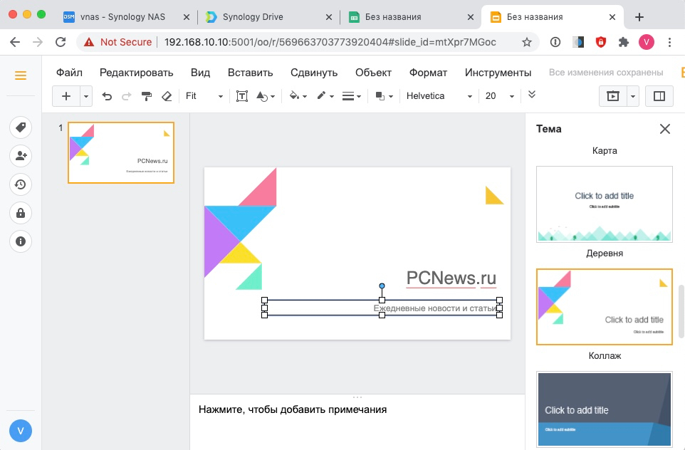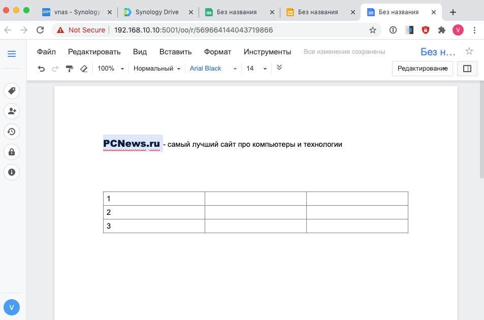 В пакете Drive реализована тесная интеграция с пакетом Synology Office, благодаря чему несколько пользователей могут одновременно работать над документами, таблицами и слайдами.