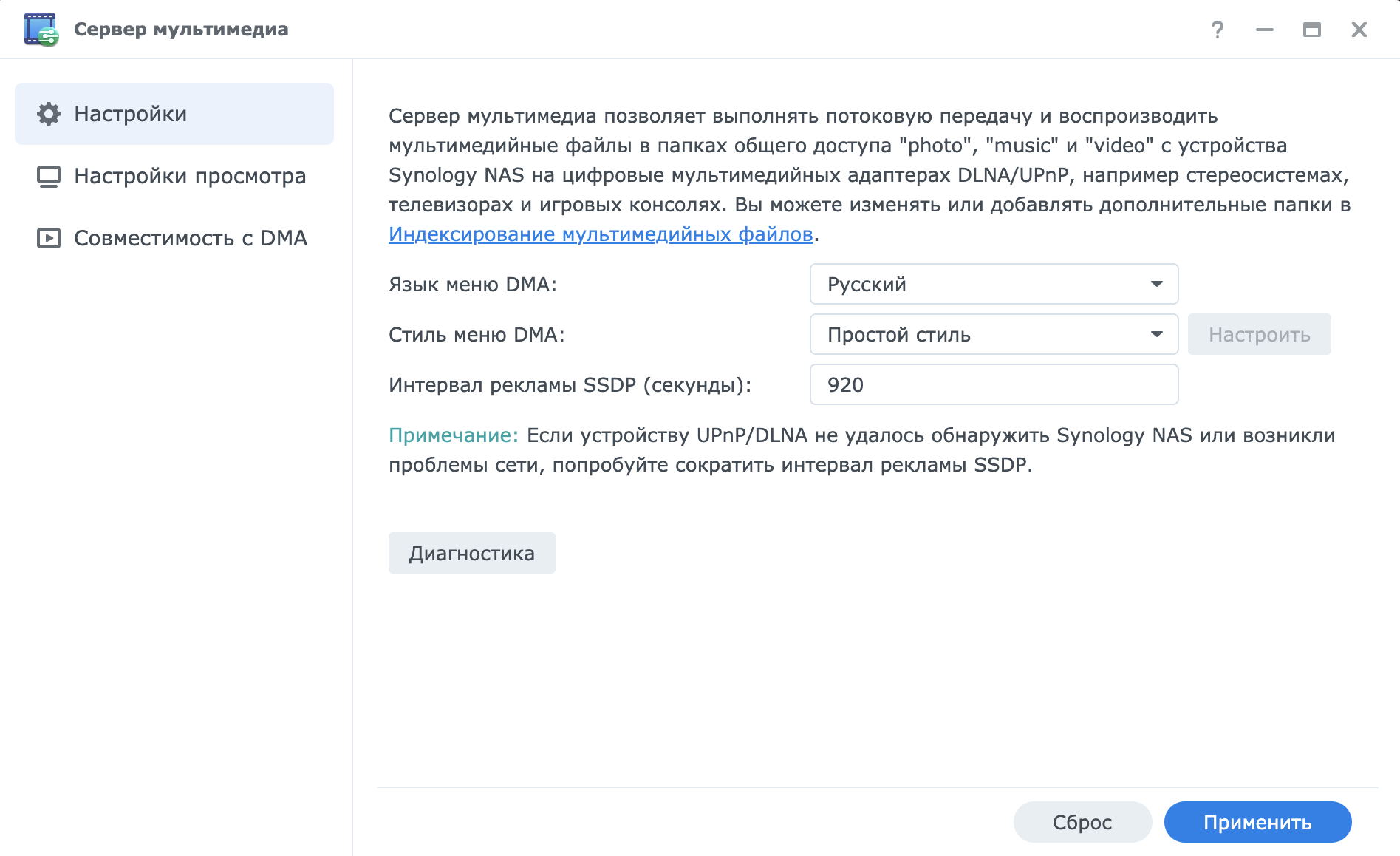 Сервер Мультимедиа предоставляет возможность просмотра мультимедийного содержимого Synology NAS на домашних устройств DLNA/UPnP.