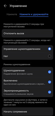 На главном экране можно увидеть уровень заряда каждого из наушников и кейса, а также включить режим «звуковой прозрачности» и шумоподавление. При этом, если у Honor Choice Earbuds X7 было предусмотрено три режима работы «шумодава», то у модели Lite — только один.