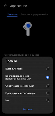 Одиночное касание заблокировано во избежание случайных срабатываний, двойные и тройные, а также длительные настраиваются через приложение. При этом система умеет различать правый и левый наушники: можно «повесить» на тройной тап по левому переход на предыдущую композицию, по правому — на следующую.