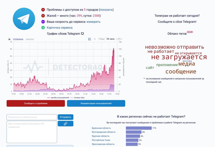 По данным сервиса Downdetector, пользователи Telegram фиксируют сбои в работе мессенджера. На странице мониторинга указано, что проблемы с доступом поступают как минимум из пяти городов, а число жалоб за последний час приблизилось к 400, за сутки — превысило 2500.
